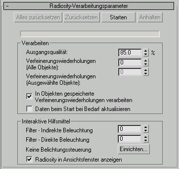 Darüber hinaus können Sie Radiosität für eine Ausgangsqualität von weniger als 100 Prozent berechnen, den Wert für "Ausgangsqualität" später erhöhen und die Lösung der Radiosität mit "Weiter" fortsetzen.
