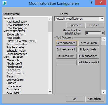 - Listet alle momentan verfügbaren Modifikatoren auf. Die Liste ist in folgende Kategorien unterteilt: Kanalinformationen, Max bearbeiten, Max Standard, Verformungen, Max Oberfläche, Oberflächen-Hilfsmittel, Modifikatoren, Radiosität, LICHT, Max Zusatz, Hülle, Spline-Bearbeitungen, Weltmodifikatoren und andere. Wenn Sie dem aktuellen Schaltflächensatz einen Modifikator hinzufügen möchten, ziehen Sie den Namen des Modifikators aus dieser Liste auf eine Schaltfläche im Bereich "Modifikatoren".