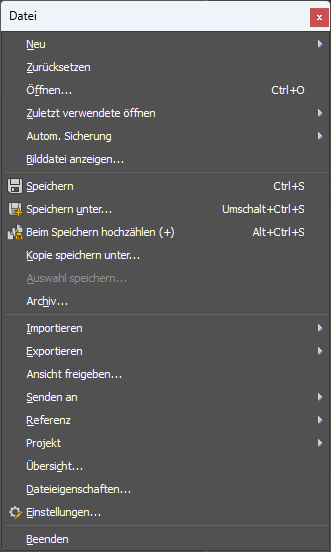 Das Menü Datei enthält Befehle für die Dateiverwaltung.