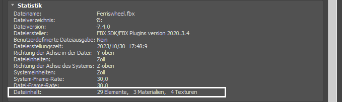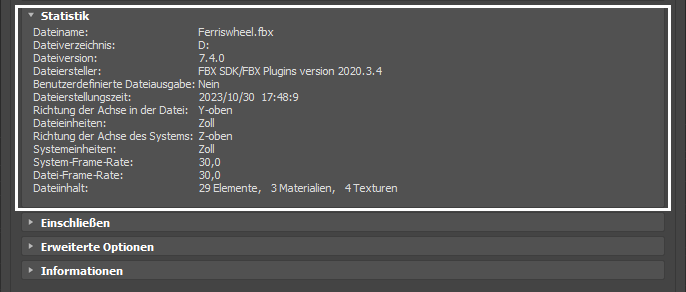 Im Fenster "Statistik" können Sie relevante Meta-Informationen über die eingehende (FBX-) Datei und System- bzw. Anwendungseinstellungen anzeigen. Die angezeigten Informationen variieren je nach Inhalt der Datei.
