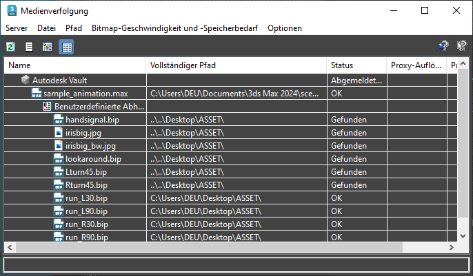 Das Dialogfeld "Medienverfolgung" zeigt alle Medien in der aktuellen Szene abhängig von der Einstellung in einer Struktur- oder Tabellenansicht an. Folgende Medien werden angezeigt: die Szenendatei, Bilder, die von der Szene in Materialien usw. verwendet werden, XRefs und fotometrische Dateien. Vorgabemäßig werden auch Ausgabedateien (z. B. gerenderte Bilder) angezeigt, Sie können diese jedoch bei Bedarf deaktivieren.