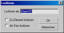 Vorgabemäßig sind die Optionen "Zu Element loslösen" und "Als Klon loslösen" deaktiviert. Wenn Sie eine Unterobjektauswahl loslösen, wird sie vom ursprünglichen Objekt getrennt und wird zu einem neuen Objekt. Die Dialogfeldoptionen ermöglichen Ihnen, das losgelöste Element als Element des ursprünglichen Objekts beizubehalten und/oder es als Kopie der ursprünglichen Auswahl loszulösen.