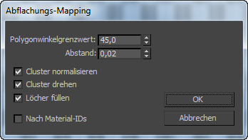 Das Abflachungs-Mapping weist Gruppen von zusammenhängenden Texturpolygonen, die innerhalb eines bestimmten Winkelgrenzwerts liegen, planare Maps zu. Es verhindert die Überschneidung von Mapping-Clustern, kann jedoch trotzdem Texturverzerrungen verursachen. Im Dialogfeld "Abflachungs-Mapping" können Sie die Definition und das Mapping von Clustern steuern.