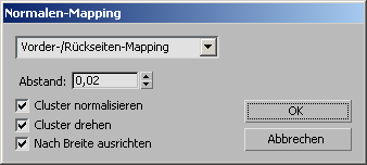 Das Normalen-Mapping weist planare Maps auf der Basis von verschiedenen Vektor-Projektionsmethoden für die Textur von Polygonen zu. Das ist die einfachste Methode, kann jedoch noch stärkere Texturverzerrungen erzeugen als mit dem Dialogfeld Abflachungs-Mapping. Im Dialogfeld "Normalen-Mapping" können Sie die Definition und das Mapping von Clustern steuern.