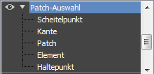 Mit dem Modifikator "Patch-Auswahl" können Sie eine Unterobjektauswahl im Stapel an nachfolgende Modifikatoren nach oben weitergeben. Er enthält einen Teil der Auswahlfunktionen des Modifikators "Patch bearbeiten". Sie können Scheitelpunkte, Kanten, Patches und Elemente auswählen. Sie können die Auswahl auch von der Unterobjektebene auf die Objektebene ändern.