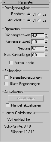 Wählen Sie ein Objekt aus, und wenden Sie den Modifikator "Optimieren" an. Das Rollout "Parameter" für diesen Modifikator wird angezeigt.