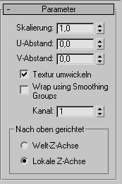 Ist diese Option aktiviert, werden Texturen um Ecken gewickelt, wenn Sie dieselben Glättungsgruppen gemeinsam haben. Das Mapping gekrümmter Wände wird glatt, und scharfe Ecken erhalten einen neuen Texturursprung. Diese Option ist nur verfügbar, wenn "Textur umwickeln" aktiviert ist. Vorgabe = Deaktiviert.