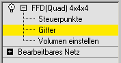 Der FFD-Modifikator umgibt die ausgewählte Geometrie mit einem Gitterrahmen. Die eingeschlossene Geometrie wird durch Verändern der Position der Steuerpunkte verformt. Wenn Sie auf die Auto-Key-Schaltfläche klicken, können Sie die Gitterpunkte und damit die Verformung der Geometrie animieren.