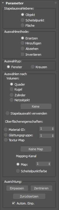 Mit diesen Steuerelementen können Sie die Auswahl mit einem Grundkörper, einem Netzobjekt oder nach Flächeneigenschaften festlegen.