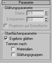 Mit diesen Steuerelementen werden Glättungsgruppen auf das Objekt angewendet und der "MeshSmooth"-Effekt durch bestimmte Oberflächeneigenschaften beschränkt.