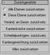 Mit diesem Rollout können Sie beliebige Änderungen, die Sie vorgenommen haben, auf die Vorgabe- oder Anfangseinstellungen zurücksetzen; z. B. Unterobjekt-Transformationen (geometrische Bearbeitung) und Änderungen an Kantenknicken, Scheitelpunkt- und Kantengewichtungen.