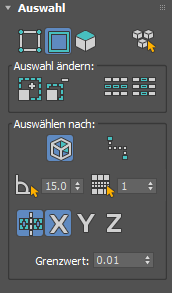 Einige Werkzeuge dienen eher einer prozeduralen als expliziten Auswahl der Unterobjekte. Beispiel: Das Hilfsmittel Erweitern: XY-Auswahl wählt automatisch Unterobjekte, die mit der aktuellen Auswahl verbunden sind. Solche Werkzeuge funktionieren im Objektraum (XY), im Gegensatz zu vergleichbaren Werkzeugen im Dialogfeld UVWs bearbeiten, die im Texturraum (UV) greifen.