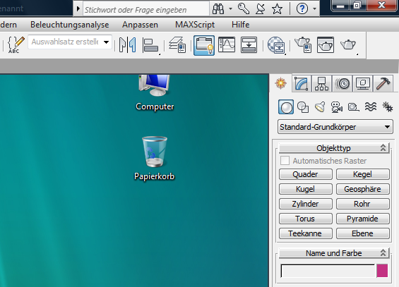 Nach dem Start von 3ds Max wird die Benutzeroberfläche angezeigt, aber Sie können den System-Desktop durch jedes der Ansichtsfenster hindurchscheinen sehen. Dieses Problem tritt normalerweise auf, wenn Ihre Anzeige auf OpenGL bzw. Direct3D konfiguriert ist, Ihre Grafikkarte jedoch OpenGL oder Direct3D nicht vollständig unterstützt.