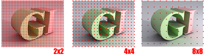 Beim Undersampling werden zunächst Samples von einem Raster entnommen, das über den Pixeln der Szene liegt. Bereiche, in denen der Kontrast zwischen einzelnen Samples ausreichend hoch ist, werden unterteilt. Anschließend werden bis zu der Bereichsmindestgröße, die mit der Einstellung "Unterteilung bis" festgelegt wurde, weitere Samples entnommen. In Bereichen, in denen keine direkten Samples entnommen werden, wird die Beleuchtung interpoliert.