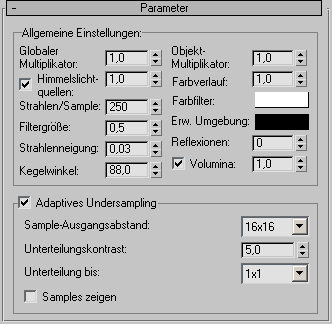 Mit diesen Steuerelementen können Sie die Renderzeit verkürzen. Sie bewirken, dass die Anzahl der Licht-Samples verringert wird. Die optimalen Einstellungen für das Undersampling unterscheiden sich erheblich zwischen einzelnen Szenen.