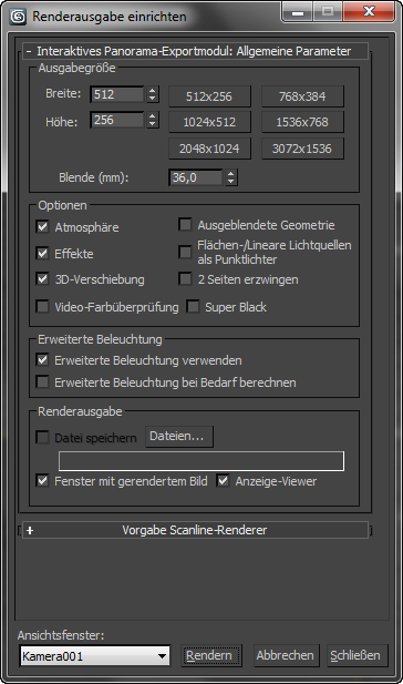 Das Dialogfeld "Renderausgabe einrichten" im Panorama-Exportmodul ist eine modale Version des Dialogfelds "Rendern einrichten", die speziell für die Erzeugung einer Panorama-Ausgabe konfiguriert wurde.
