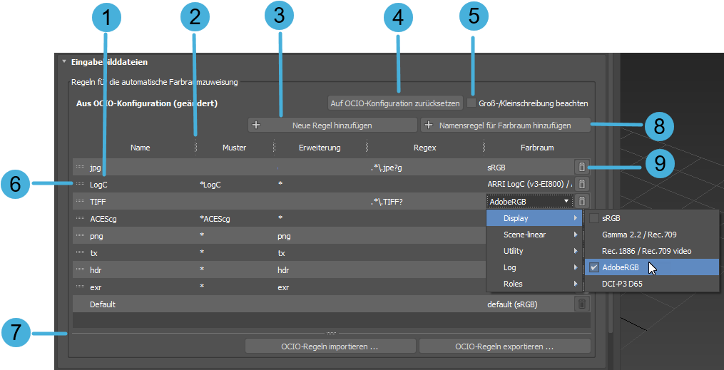 Farbverwaltungseinstellungen bearbeiten. Die Regeln sind nur verfügbar, wenn Sie einen OCIO-basierten Farbverwaltungsmodus verwenden. Es gibt drei Arten von Regeln: