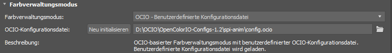 Anmerkung: Wenn die OCIO-Umgebungsvariable nicht auf den vollständigen Pfad einer gültigen OCIO-Konfigurationsdatei auf Ihrem System gesetzt wurde, enthält die Beschreibung die Meldung „Keine Konfigurationsdatei geladen ...“, und Farben werden nicht verwaltet.