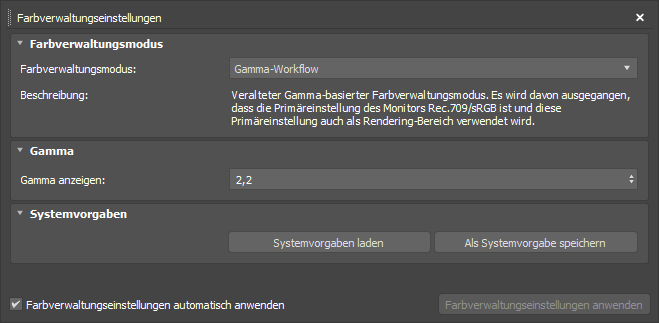 - Dies ist der ältere Gamma-basierte Farbverwaltungsmodus. Farben werden genauso behandelt wie in Versionen von 3ds Max vor 2024. Die Gamma-Verschlüsselung wird für Farbeingaben entfernt und anschließend nach Durchführung der Beleuchtungsberechnungen erneut für die Anzeige und Ausgabe angewendet. In diesem Modus wird davon ausgegangen, dass die Primärfarben des Monitors Rec.709/sRGB sind und diese ebenfalls zum Rendern verwendet werden. Siehe "Optionen für den Gamma-Workflow" weiter unten.