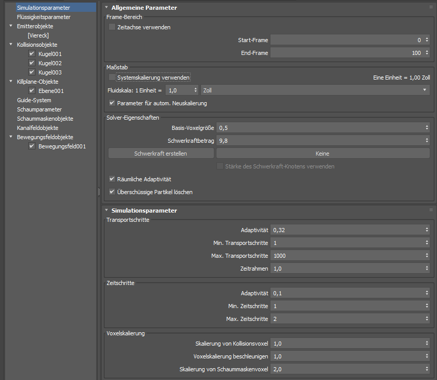 - Legt die Simulationsparameter der obersten Ebene fest, wie z. B. die Skalierung, die Basis-Voxelgröße und Schwerkrafteinstellungen sowie Transport- und Zeitschritte.