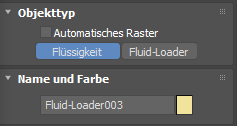 Zeigt den automatisch zugewiesenen Namen und die Ansichtsfensterfarbe des Flüssigkeits- und Fluid-Loader-Objekts an. Diese Eigenschaft kann bearbeitet werden.