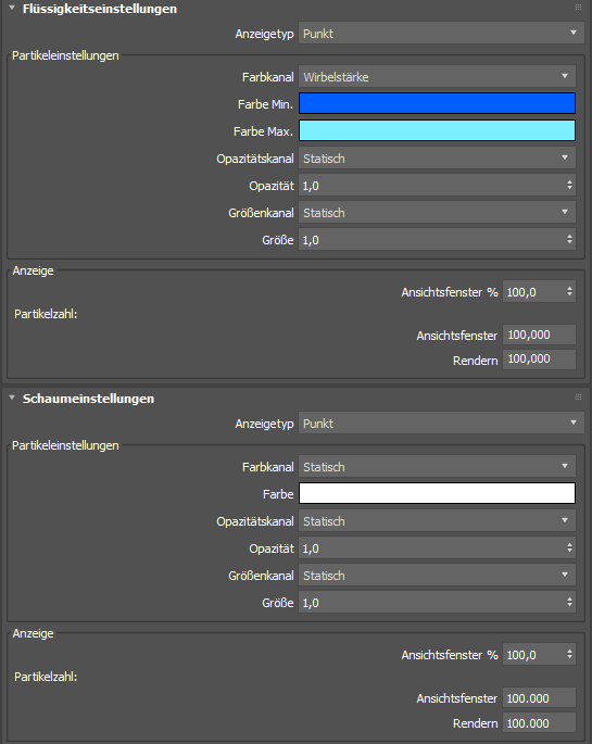 - Legt den Prozentanteil der Flüssigkeitspartikel fest, die im Ansichtsfenster angezeigt werden sollen.