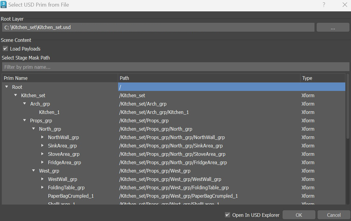 • Ensure you have Open in USD Explorer selected so you can immediately view a tree hierarchy of your scene make edits to visibility and more for your USD Stage.