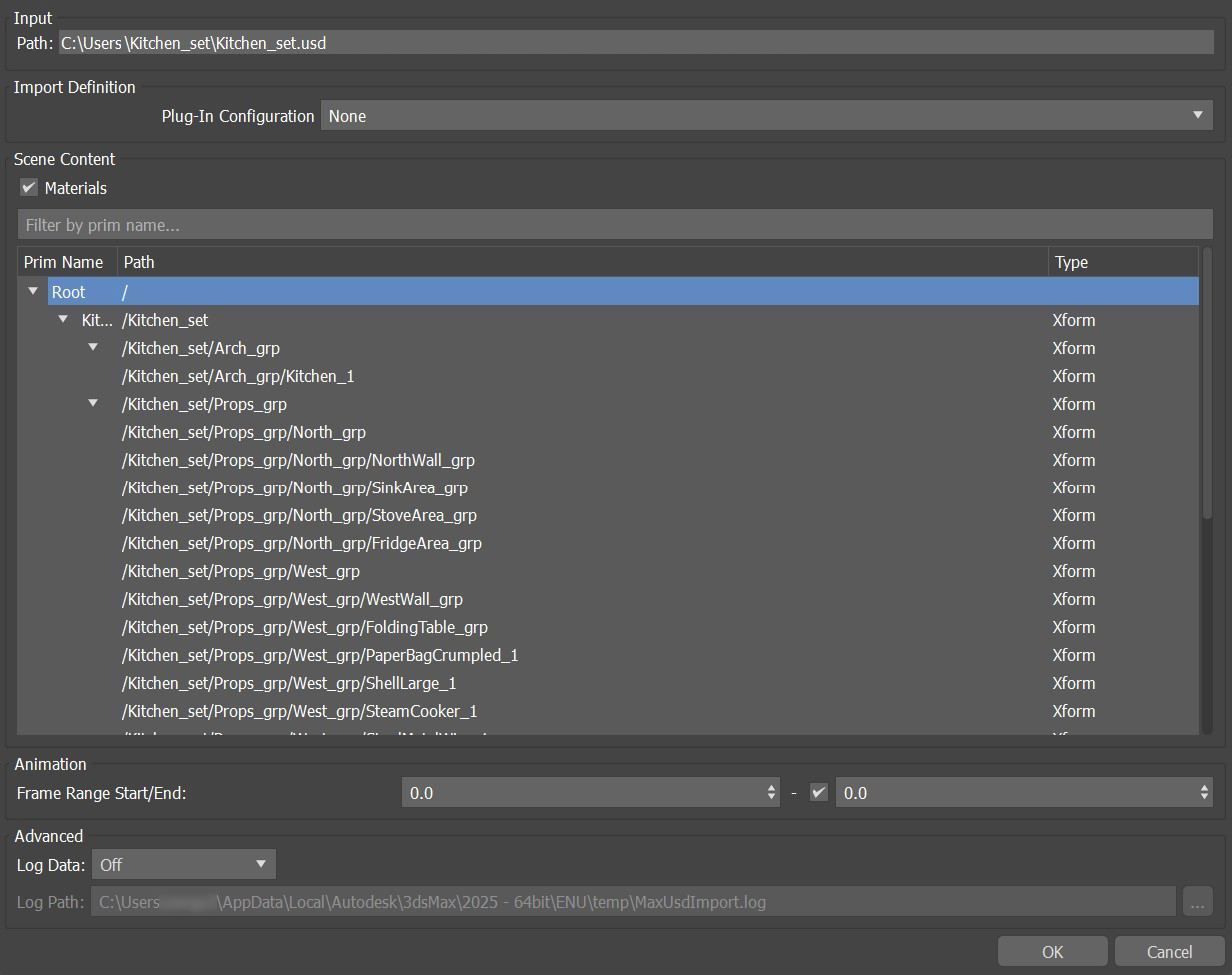 A USD file consists of prims, the primary container object in USD. Prims can contain any scene element (such as meshes, lights, cameras). The import settings give you the following USD prim-specific options: