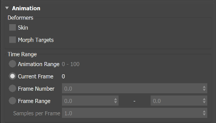 Select the time at which animation data is exported from your scene. You can select a frame range to export to USD and the animations will be cached into USD. Choose from the following options:
