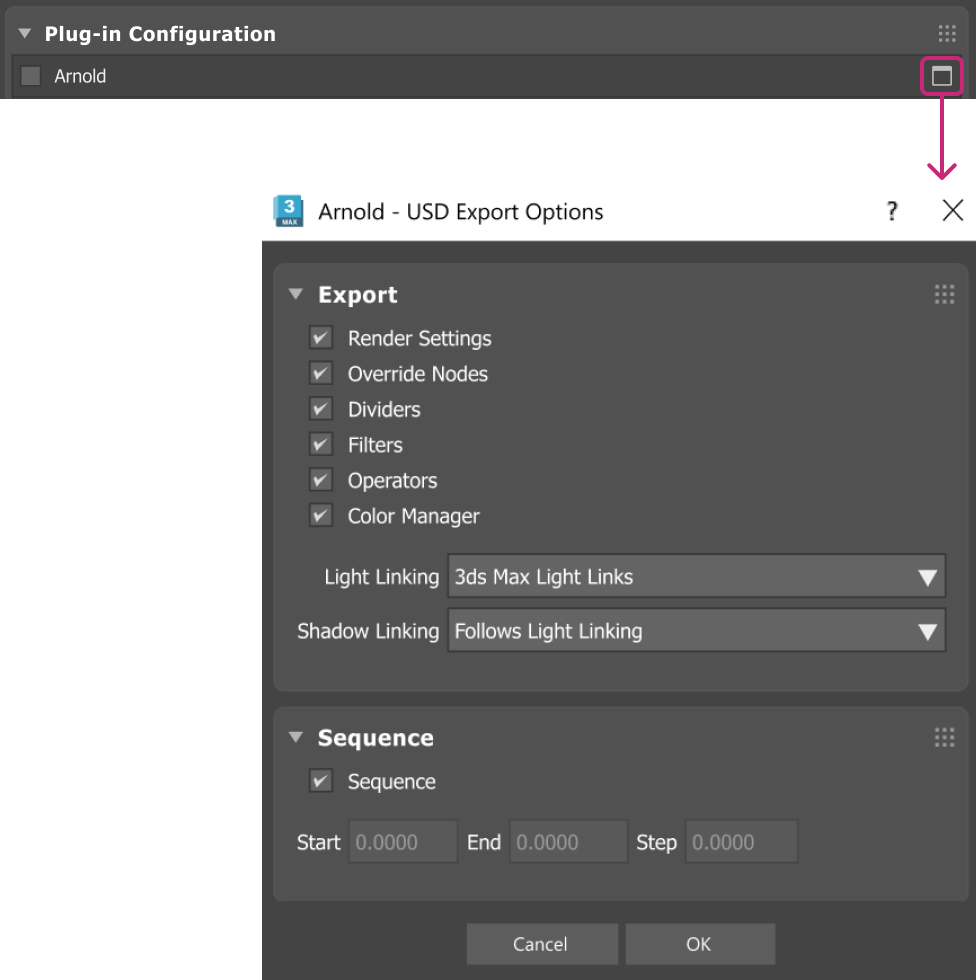 USD Stages: When on, USD stage objects or prims that are found in the 3ds Max scene are exported as USD references to whatever the root layer of that stage object is.