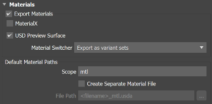 Export Materials: If selected, material targets defined in this group and through plug-in configurations are used for USD export. A basic material is always exported, even when the material is not understood during material translation (name and diffuse color is written out to the export). This materials list can also grow and provide more options depending on available plug-in additions, custom shader and chaser networks. See Advanced Workflows below to learn more.