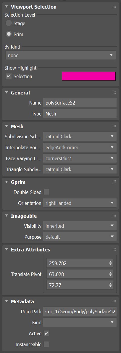 - Active: Turn off to deactivate the selected prim. Once deactivated, the prim will not appear in the Viewport or Render, and will not be included in traversals of the prim hierarchy.
