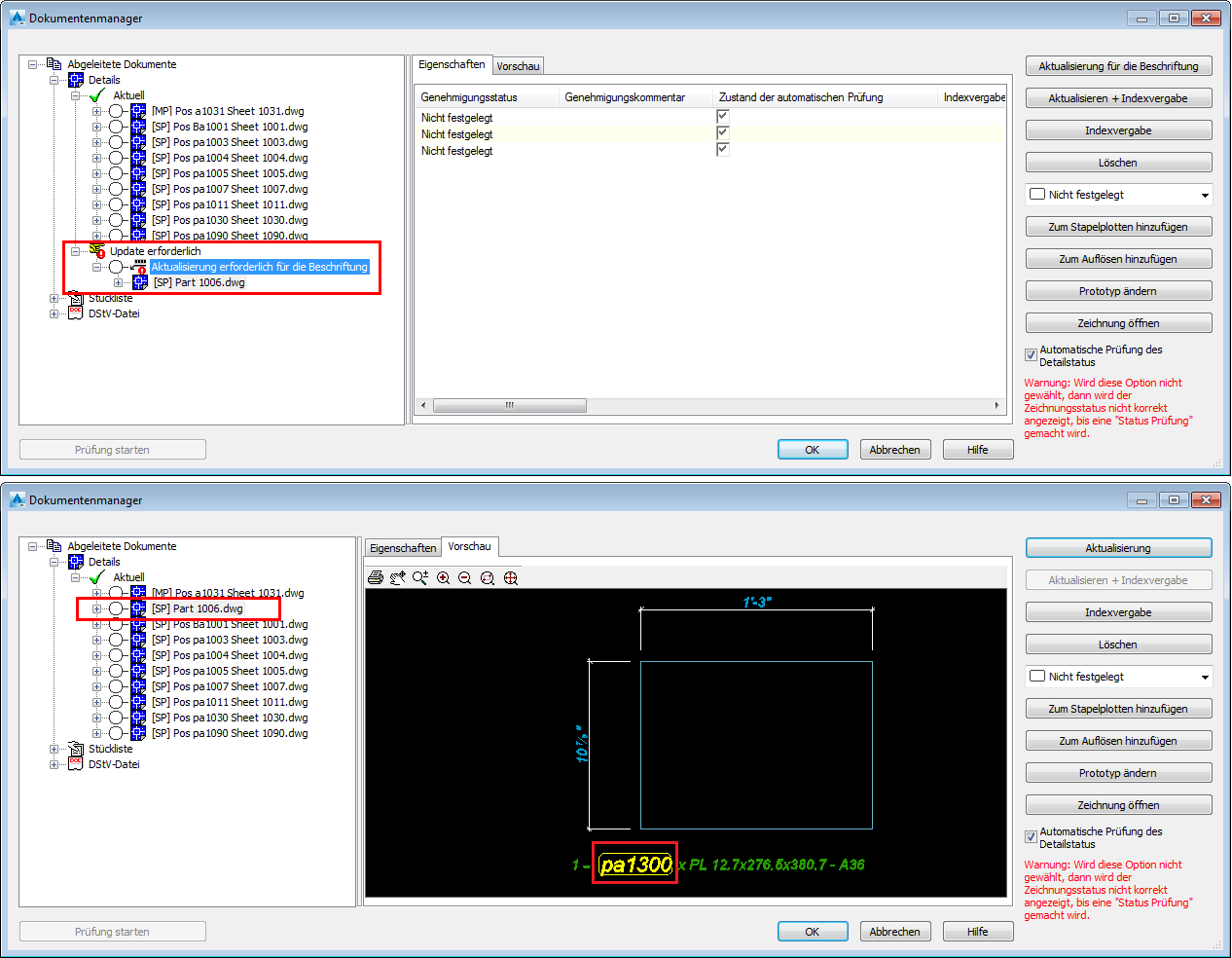 Sie können Zeichnungen direkt über den Dokumentenmanager aktualisieren. Darüber hinaus können Sie das Verhalten des Dokumentenmanagers für die Prüfung des Detailstatus steuern.