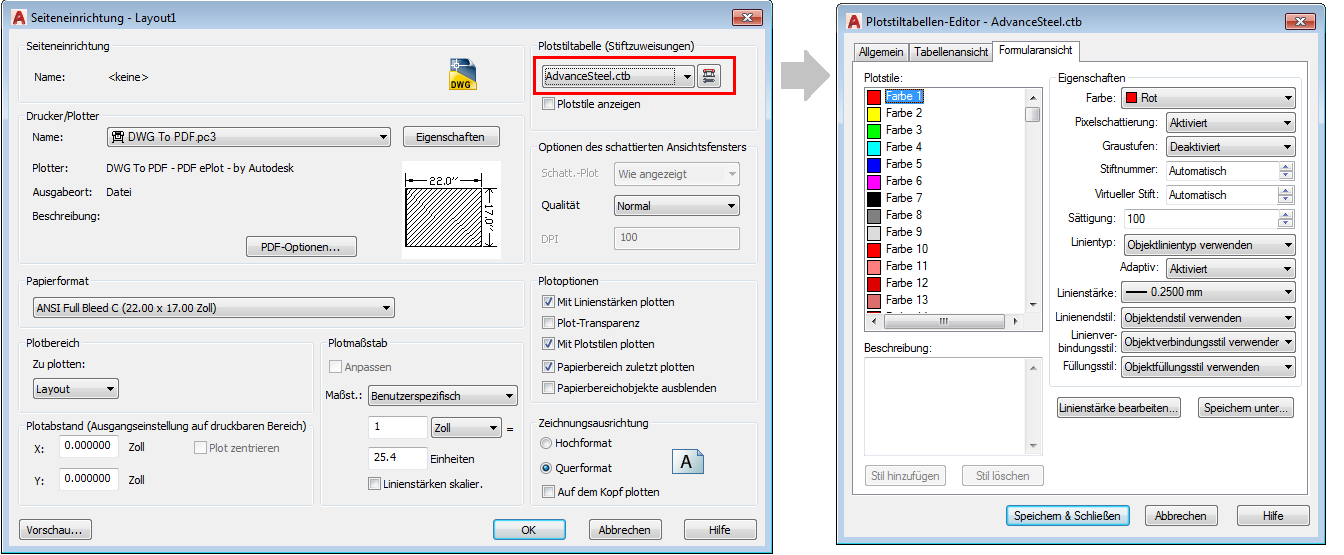 - Bestimmen Sie, welche CTB zum Plotten verwendet werden soll. Mit der CTB können Sie die Linienstärke durch Farben steuern. Advance Steel steuert die Farben zur Detaillierung der einzelnen Objekte, nicht aber der Linienstärke. Sie können dies zum Drucken steuern, indem Sie die CTB verwenden, die Farben Linienstärken zuordnet: