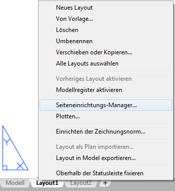 - Klicken Sie mit der rechten Maustaste auf die Registerkarte Layout, und wählen Sie die Option Seiteneinrichtungs-Manager aus dem Kontextmenü aus: