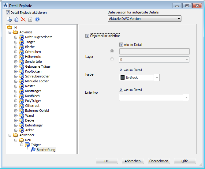 Aktiviert die Einstellungen für Detail auflösen. Beim Auflösen von Zeichnungen wird für jedes Objekt oder Unterobjekt eine entsprechende Einstellung im aktuellen Profil gesucht. Wenn es keine Einstellung gibt, werden die Auflösungseinstellungen aus der Advance Steel-Kategorie verwendet.