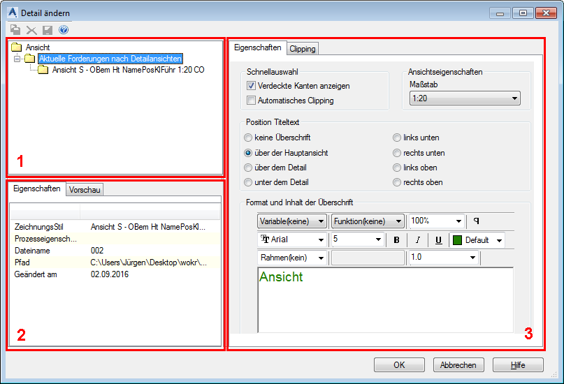 Die Eigenschaften der ausgewählten Ansicht werden auf der rechten Seite des Dialogfelds angezeigt. Durch Auswählen von Aktuelle Forderungen nach Detailansichten werden die Überschrift und andere Eigenschaften für das ganze Detail definiert.