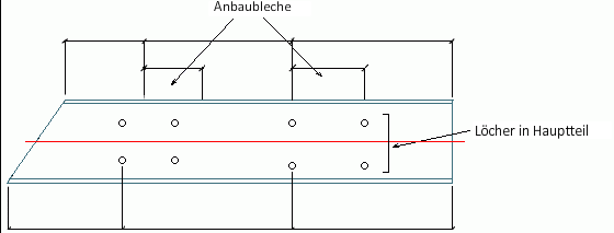 Beide angebauten Bleche und alle Gruppen von Löchern aus dem Hauptteil werden wie in der folgenden Abbildung dargestellt bemaßt.