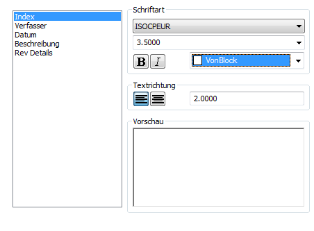 Diese Registerkarten ermöglichen das Einrichten des Textformats für die Überschrift und für den Text, der in der Revisionstabelle angezeigt wird. Auf der linken Seite des Dialogfelds werden die Spalten der Revisionstabelle angezeigt. Wählen Sie die Spalte aus, für die Sie die Textformatierung ändern möchten.