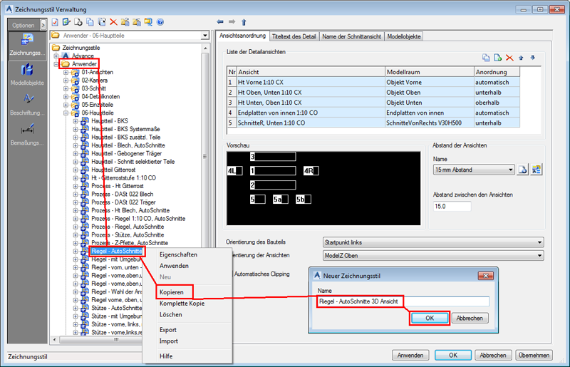 - Kopieren Sie in der Zeichnungsstil-Verwaltung in der Kategorie Anwender den Zeichnungsstil Riegel - AutoSchnitte und benennen Sie ihn in Riegel - 3D-Ansicht um.