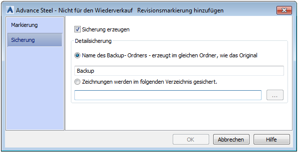 Auf dieser Registerkarte können Sie eine Sicherungskopie der Zeichnung anlegen, bevor sie eine Revisionsmarkierung erhält.