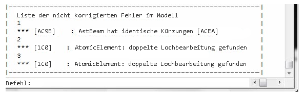 Es kann vorkommen, dass im Modell Bearbeitungen vorhanden sind, die ungültig sind oder vorhandene Bearbeitungen überlappen. Sie können diese mit dem Befehl Audit finden. Die Ergebnisliste enthält die Objekt-Handle-ID und eine Meldung, die das Problem beschreibt, wie im folgenden Beispiel gezeigt: