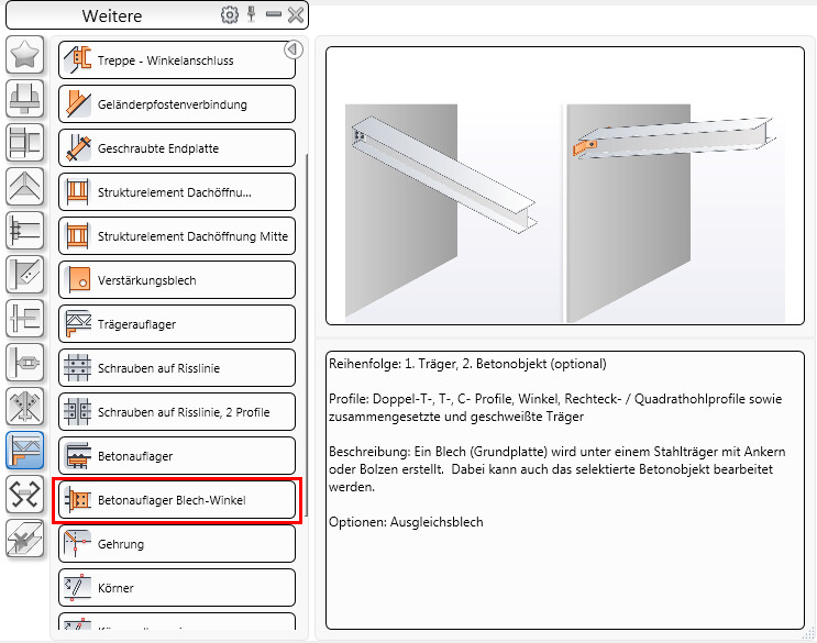 Der Anschluss Betonauflager Blech-Winkel kann nur zwischen bestimmten Typen von Betonelementen (Wand, Decke, Träger) und einigen der Stahlprofile (I, T, C, L, geschweißt, zusammengesetzt oder mit Entformungsschräge) verwendet werden.