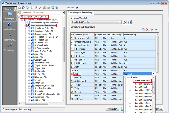 Nachdem Sie die Vorschrift festgelegt haben, ändern Sie den Zeichnungsstil, damit Sie die Ansicht erstellen können. Ändern Sie unter Darstellung und Beschriftung den Beschriftungstyp der Bleche und wählen Sie aus der Kategorie Bleche die Vorschrift Anschlussname.