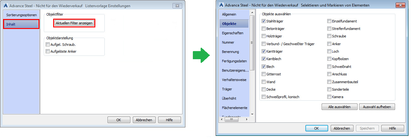 Auf der Registerkarte Inhalt können Sie Objekte filtern, wobei Sie über die Schaltfläche Aktuellen Filter anzeigen das Dialogfeld Selektieren und Markieren von Elementen aufrufen können.