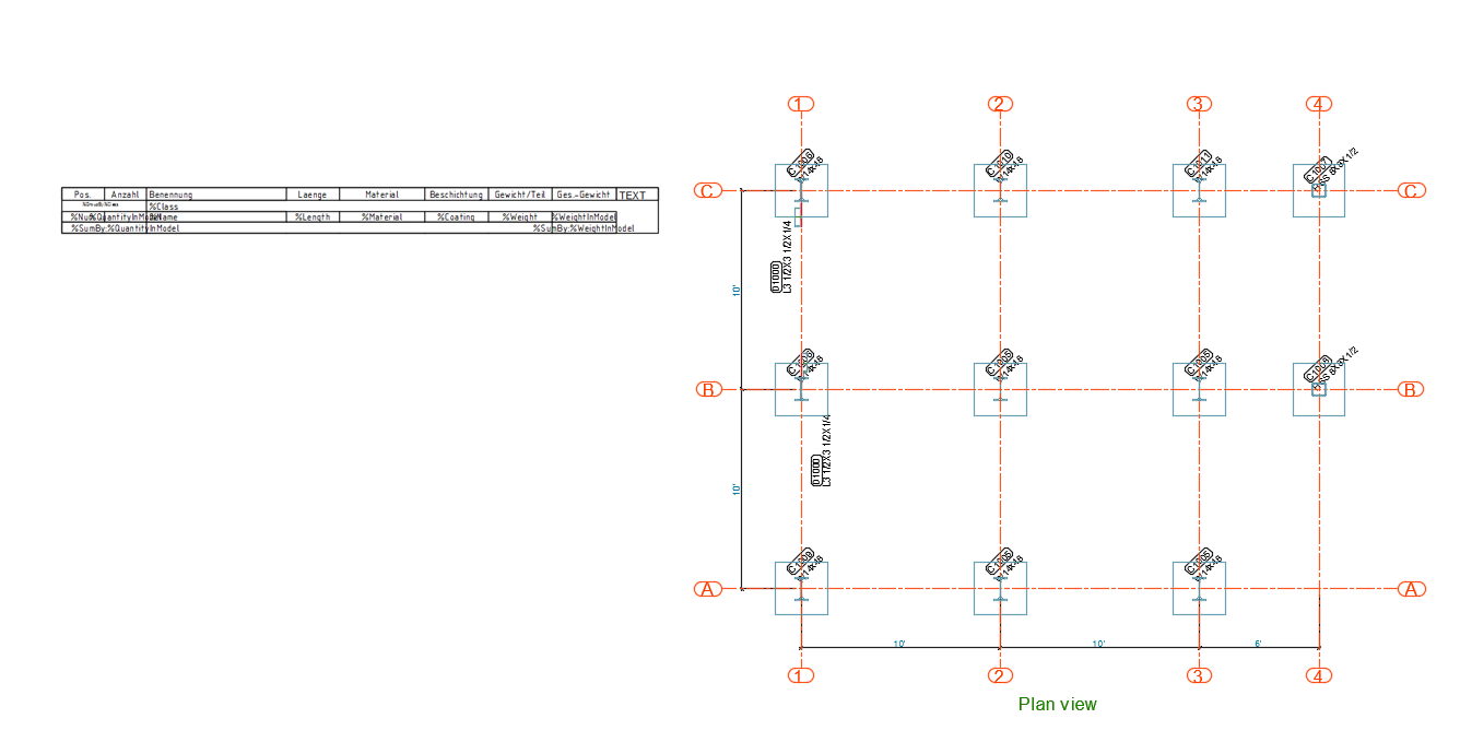 Eine Advance Steel-Stücklistenvorlage enthält eine Reihe von Advance Steel-Objekten (ASTXBOMTEMPLATETEXT), die unter Verwendung von AutoCAD-Gruppierungsverfahren unter bestimmten Gruppennamen zusammengefasst sind. Wird dies aufgelöst, erhalten Sie Linien und Text, die auch in gruppierter Form nicht als Advance Steel-Stücklistevorlage verwendbar sind.