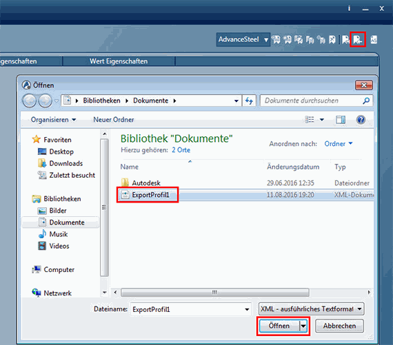 Um das neue Profil zu importieren, wird die Option Datei importieren verwendet. Die XML-Datei wird ausgewählt, und die Option "Öffnen" wird aufgerufen. Dann wird der Name des importierten Profils eingegeben.