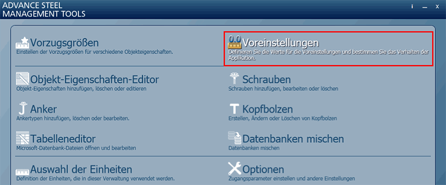 Das neu importierte Profil kann als aktuell festgelegt werden, indem Sie den Befehl Profil auf "aktuell" setzen verwenden. Nach dem Öffnen von Advance Steel sind alle Vorgabeeinstellungen verfügbar.