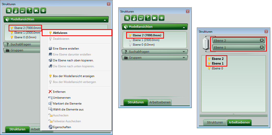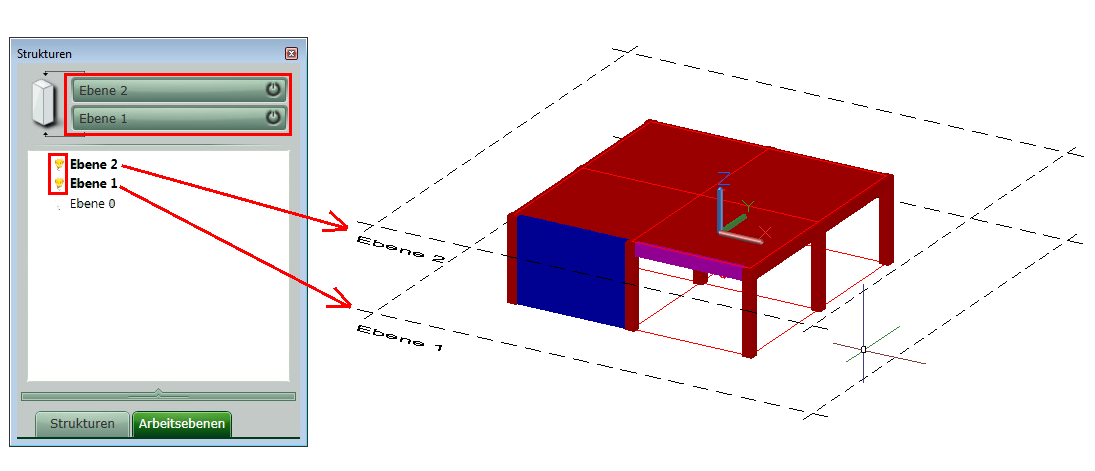 Wenn eine Ebene aktiviert ist, werden die neuen Modellelemente auf den Arbeitsebenen der aktivierten Ebene erstellt.