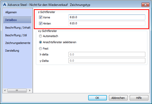 - Das Fenster Zeichnungstyp wird geöffnet und auf der Registerkarte Detailbox werden die Parameter des Z-Ansichtsfensters angezeigt.